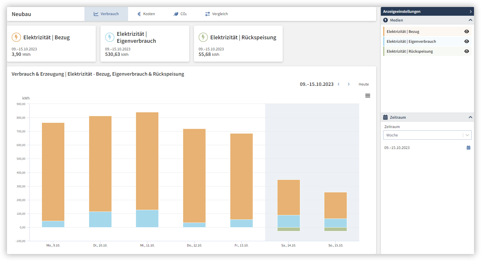 Das Diagramm zeigt Ihnen die Menge der bezogenen, selbst verbrauchten und rückgespeisten Energie.