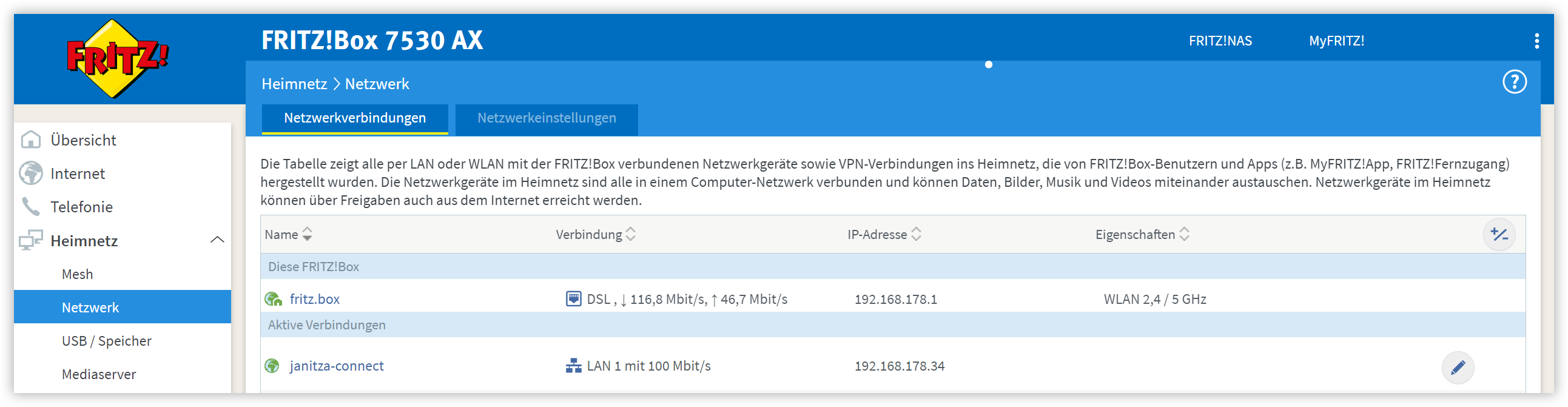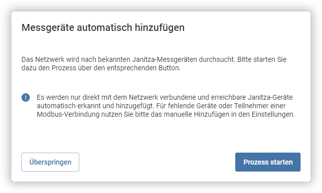 Neu verbundene Janitza-Messgeräte werden auch im laufenden Betrieb automatisch erkannt. Es kann bis zu 30 Minuten dauern, bis Messwerte ausgelesen werden. Stellen Sie sicher, dass die jeweilige Messgeräte-Firmware aktuell ist, um die automatische Erkennung zu gewährleisten.