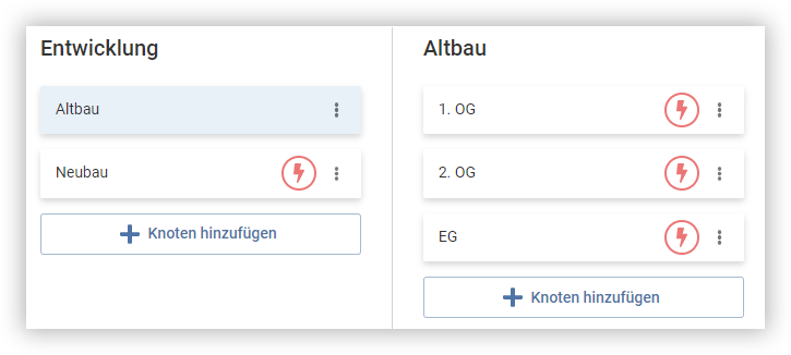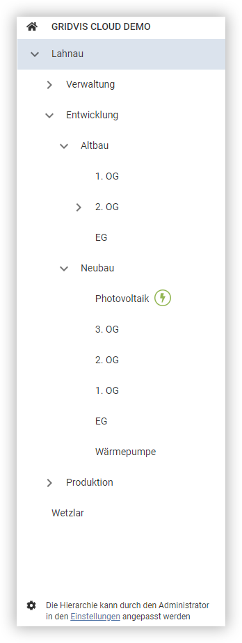 Im Hierarchie-Editor kann eine individuelle Struktur hinterlegt und angepasst werden. Die dort hinterlegte Struktur wird in der GridVis Cloud als seitliche Navigationsleiste angezeigt und dient als zentrales Bedienelement zur automatischen Filterung der angezeigten Daten.