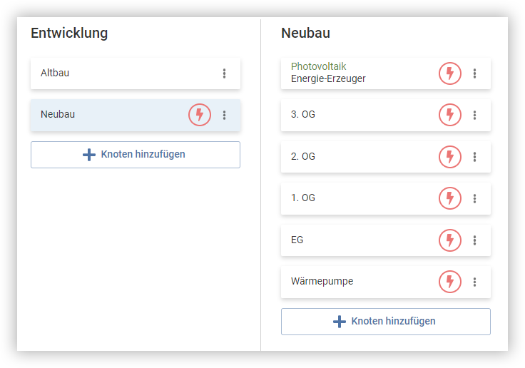 In den Visualisierungen im Dashboard und im Analyse-Tab werden für diesen übergeordneten Knoten die Verbrauchsdaten und Messwerte des zugeordneten Datenpunktes angezeigt.