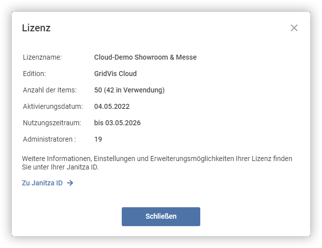Im Untermenü Lizenz sehen Sie die Informationen zur aktuell verwendeten Lizenz für die GridVis Cloud.