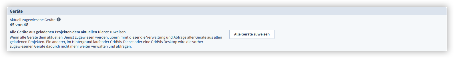 Sie können die Verwaltung Ihrer Geräte der GridVis-Web zuweisen. Wenn Sie Ihre Geräte der GridVis-Web zuweisen, übernimmt diese die Abfrage der Geräte aller in der GridVis-Web hinzugefügten Projekte. Die ausgelesenen Daten werden dann in der GridVis-Web gespeichert. Klicken Sie auf die Schaltfläche Alle Geräte zuweisen, um Ihre Geräte von der GridVis-Web verwalten zu lassen.