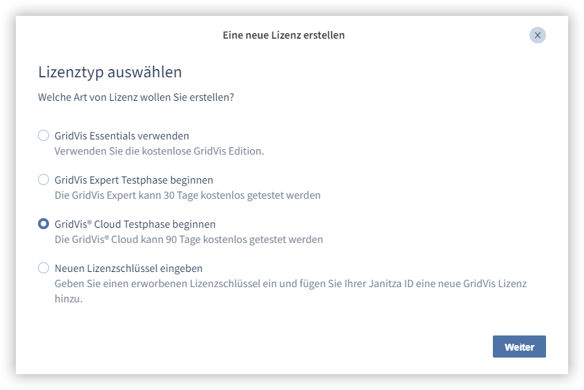 - Wählen Sie den Punkt GridVis Cloud Testphase beginnen aus und klicken Sie auf die Schaltfläche Weiter