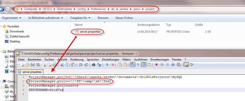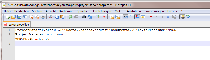 Im GridVisData Verzeichnis zur Datei "server.properties" wechseln -> C:\GridVisData\config\Preferences\de\janitza\pasw\project